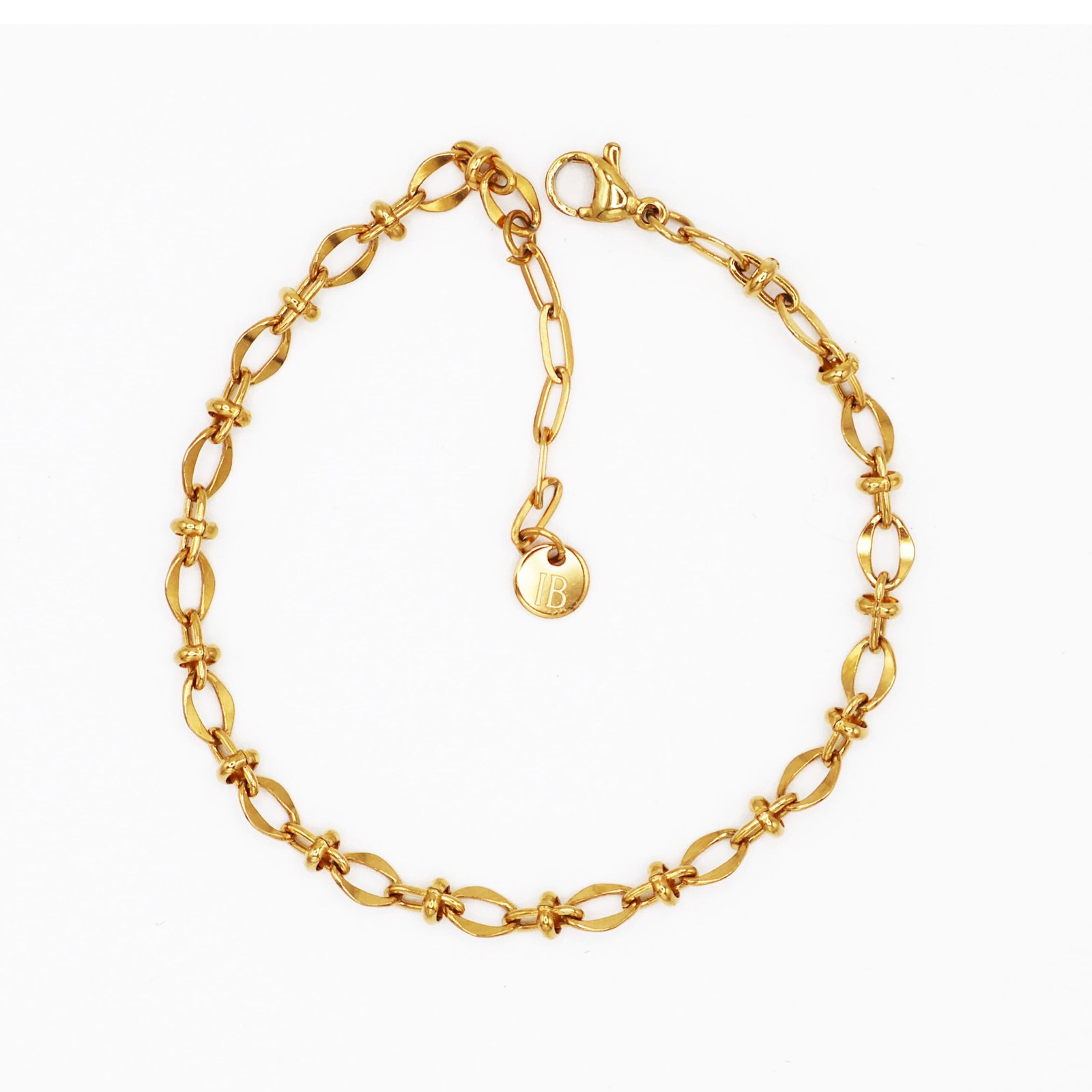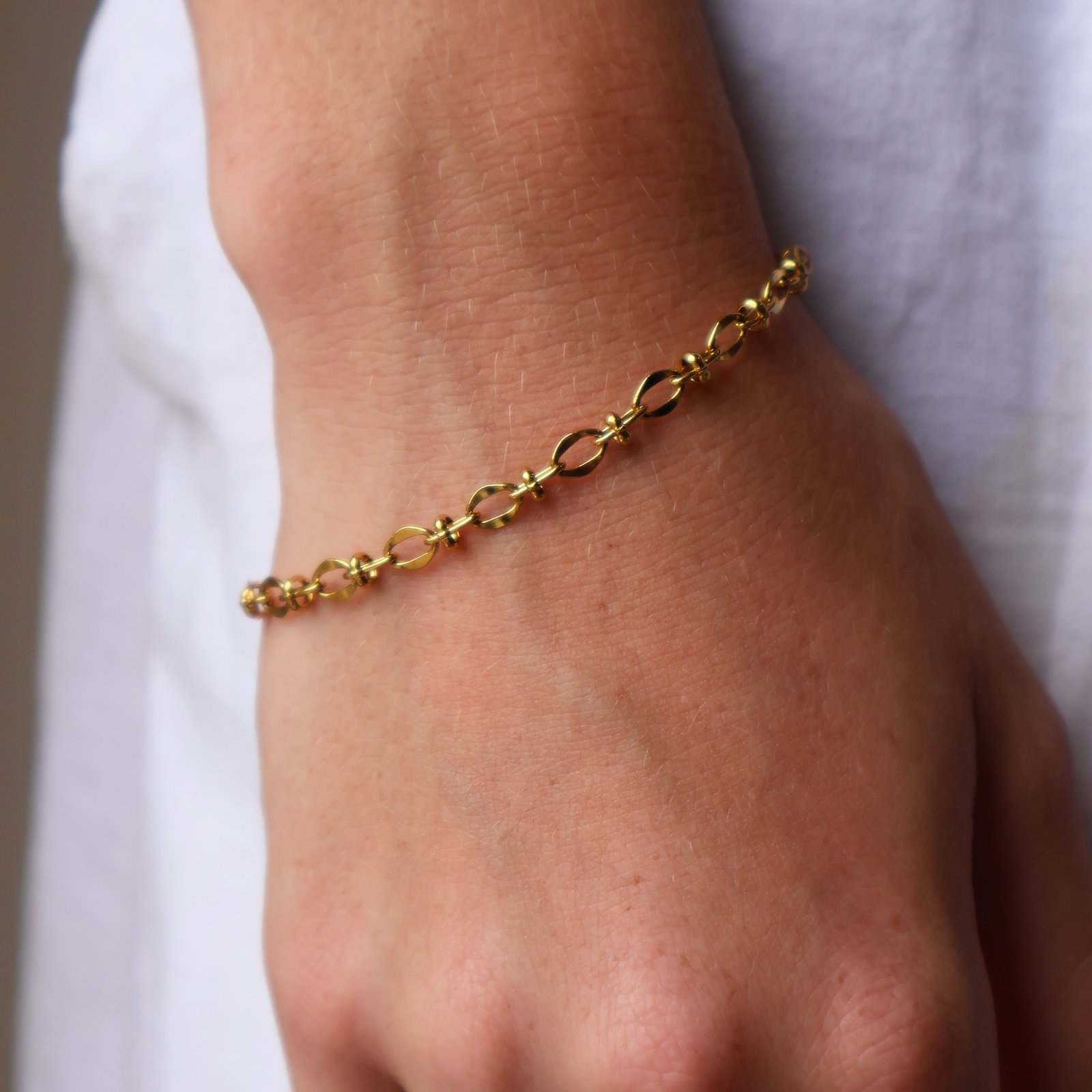✨ The Brianna Bracelet is a timeless gold chain featuring oval links accented with bar details for a refined, modern look. Designed to be both durable and elegant, it’s perfect for everyday wear or dressing up your evening style. Lightweight and versatile, this bracelet layers beautifully with other pieces or makes a statement on its own. ✨