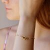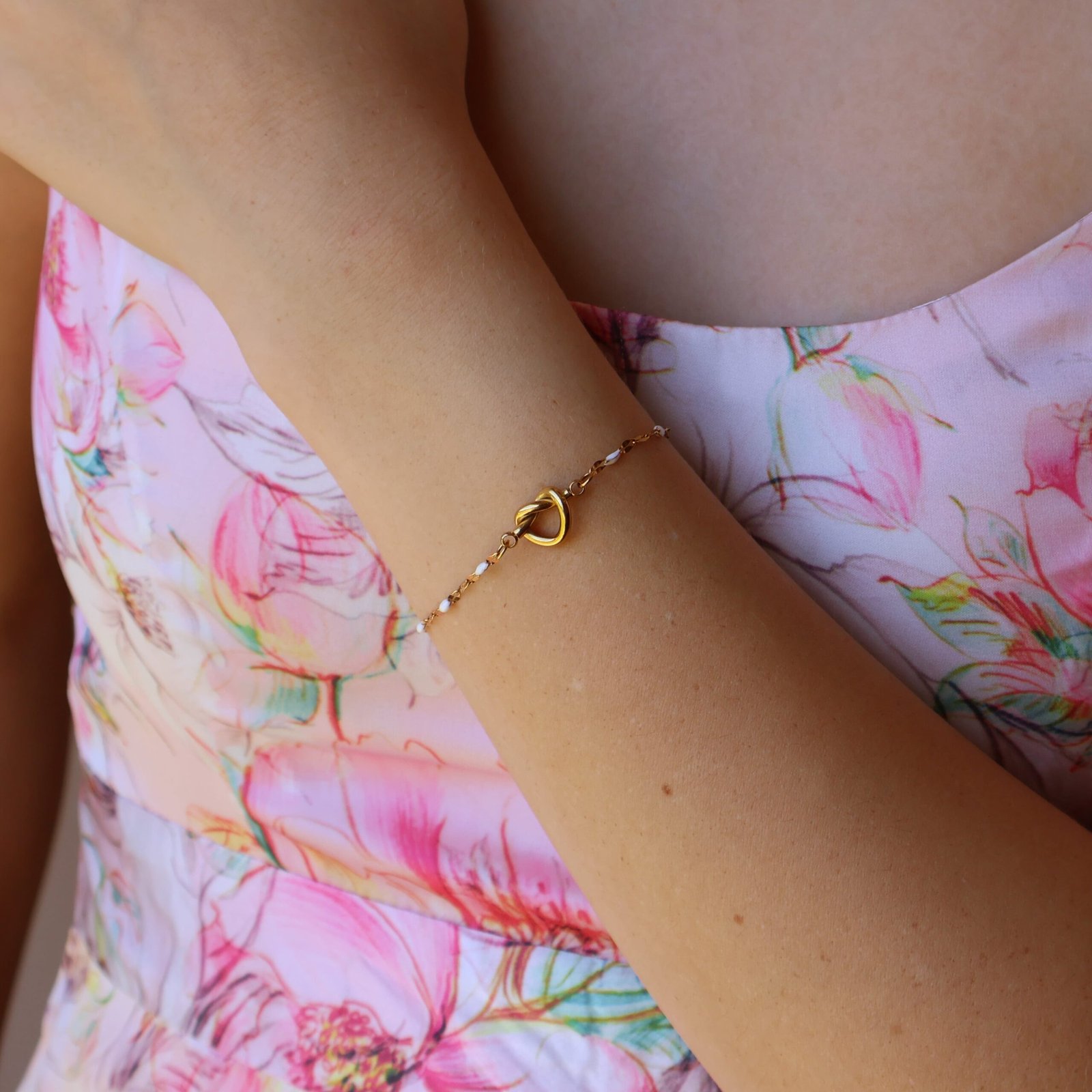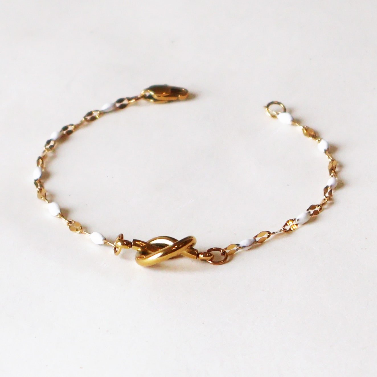 ✨ Celebrate connection and timeless elegance with the Lovers Knot Bracelet. This delicate gold-tone chain features dainty white accents, beautifully paired with a symbolic knot clasp representing love and unity. Lightweight and versatile, it’s perfect for everyday wear or layering with other bracelets for a chic stacked look. A meaningful gift or a personal keepsake, the Lovers Knot Bracelet adds both sentiment and style to your jewelry collection. ✨