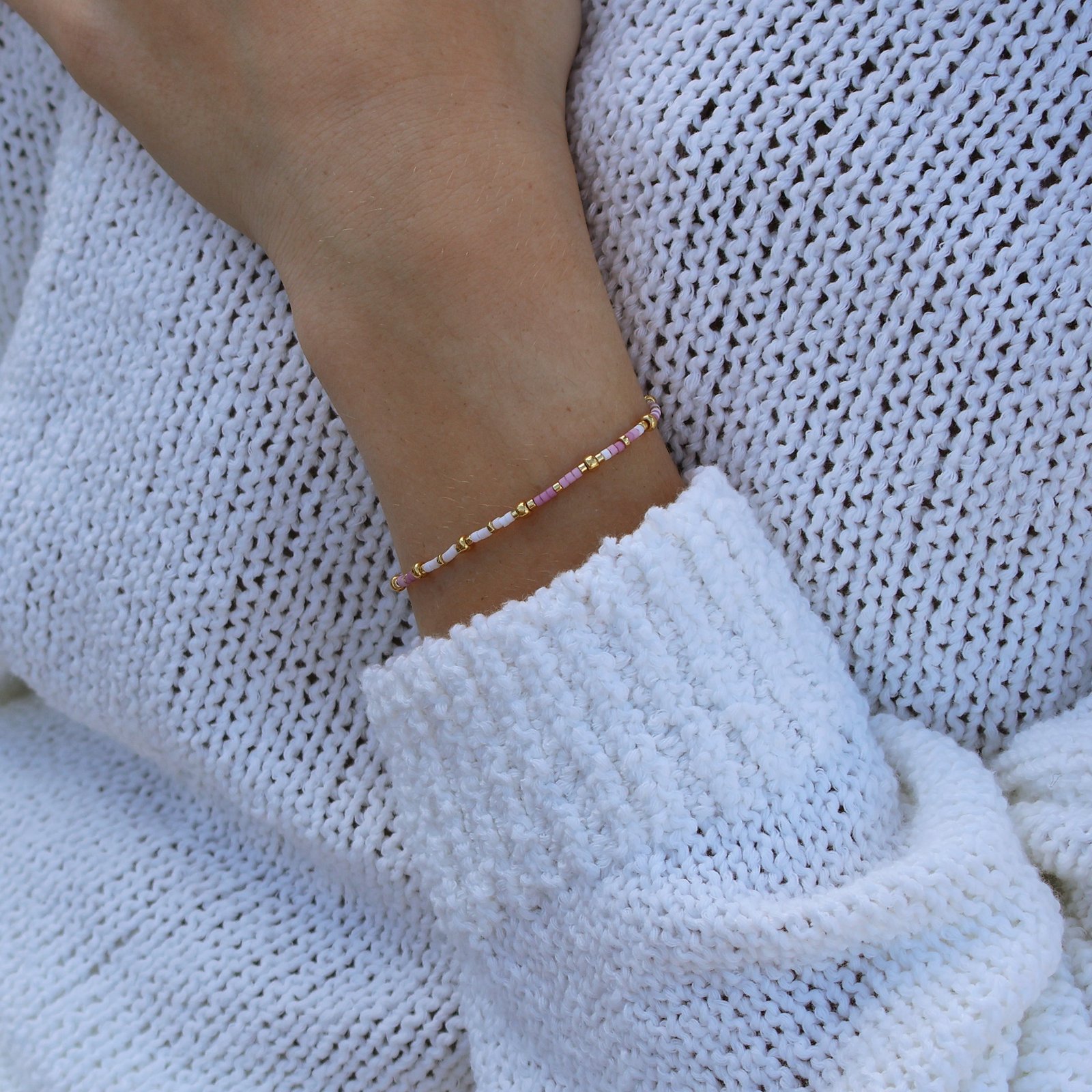 ✨ The Lucy Bracelet is a feminine and playful piece, handcrafted with Miyuki Japanese glass beads in shades of soft pink, lilac, and white, highlighted with gleaming gold accents. Designed to be worn alone for a subtle touch of colour or stacked with other bracelets for a layered look, this piece brings versatility and charm. Lightweight and comfortable, the Lucy Bracelet embodies coastal luxe elegance, making it a perfect everyday accessory. ✨