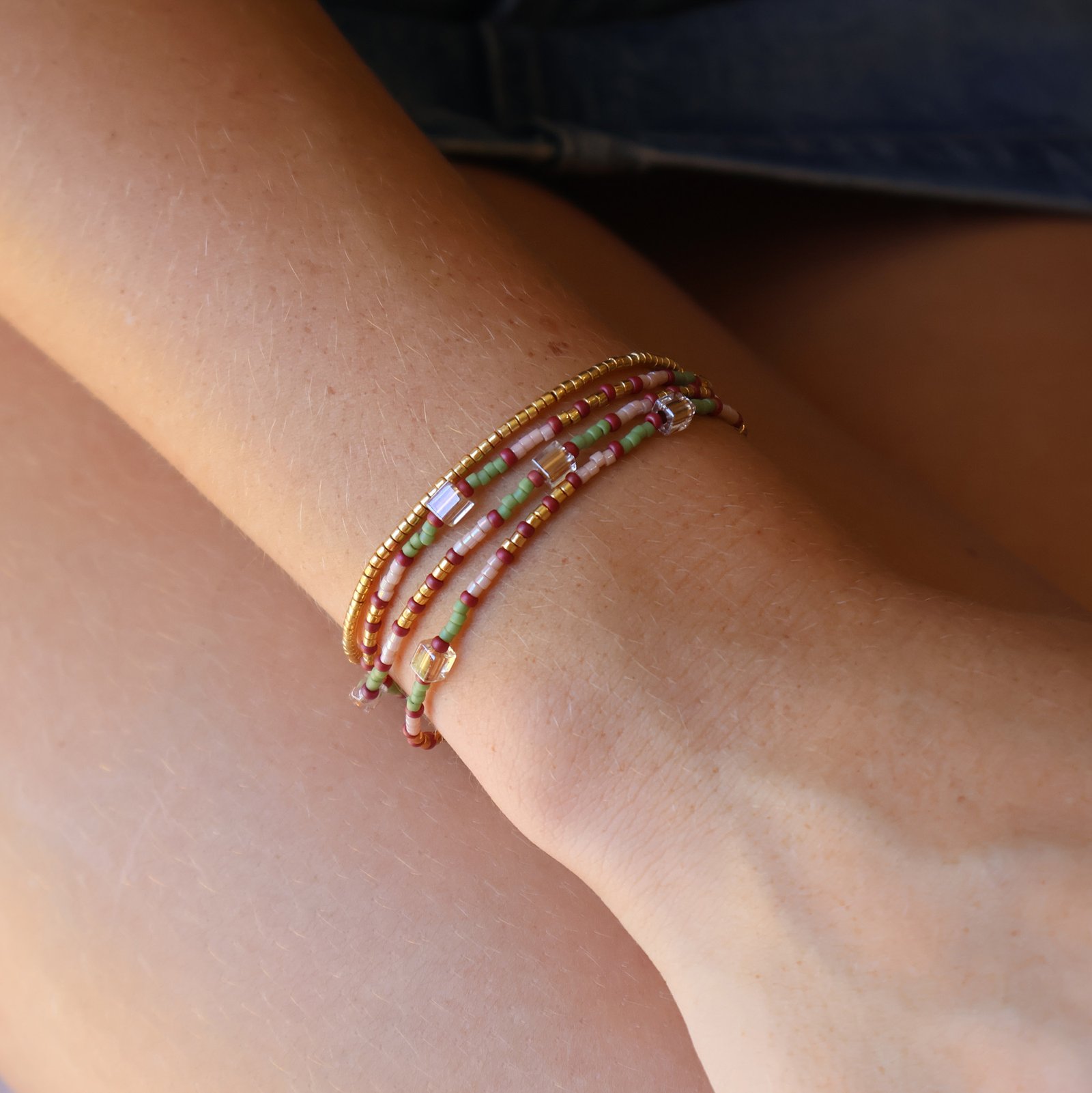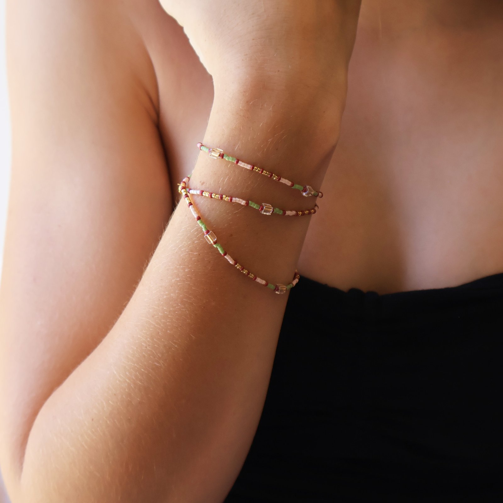 Meet the Mahi Wrap Bracelet – a bright, summery wrap designed to bring instant colour to your stack. Featuring a playful mix of watermelon-pink, soft green, rich red, gold accents and clear crystal cubes, this handmade bracelet wraps beautifully for a full, layered look. Lightweight and comfortable, it’s perfect for mixing with your Illuka Blue waterproof chains or other beaded favourites. A colourful, tropical-inspired wrap made for sun-chasing days and everyday fun.