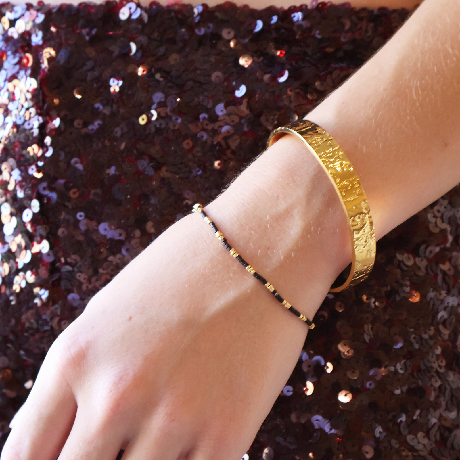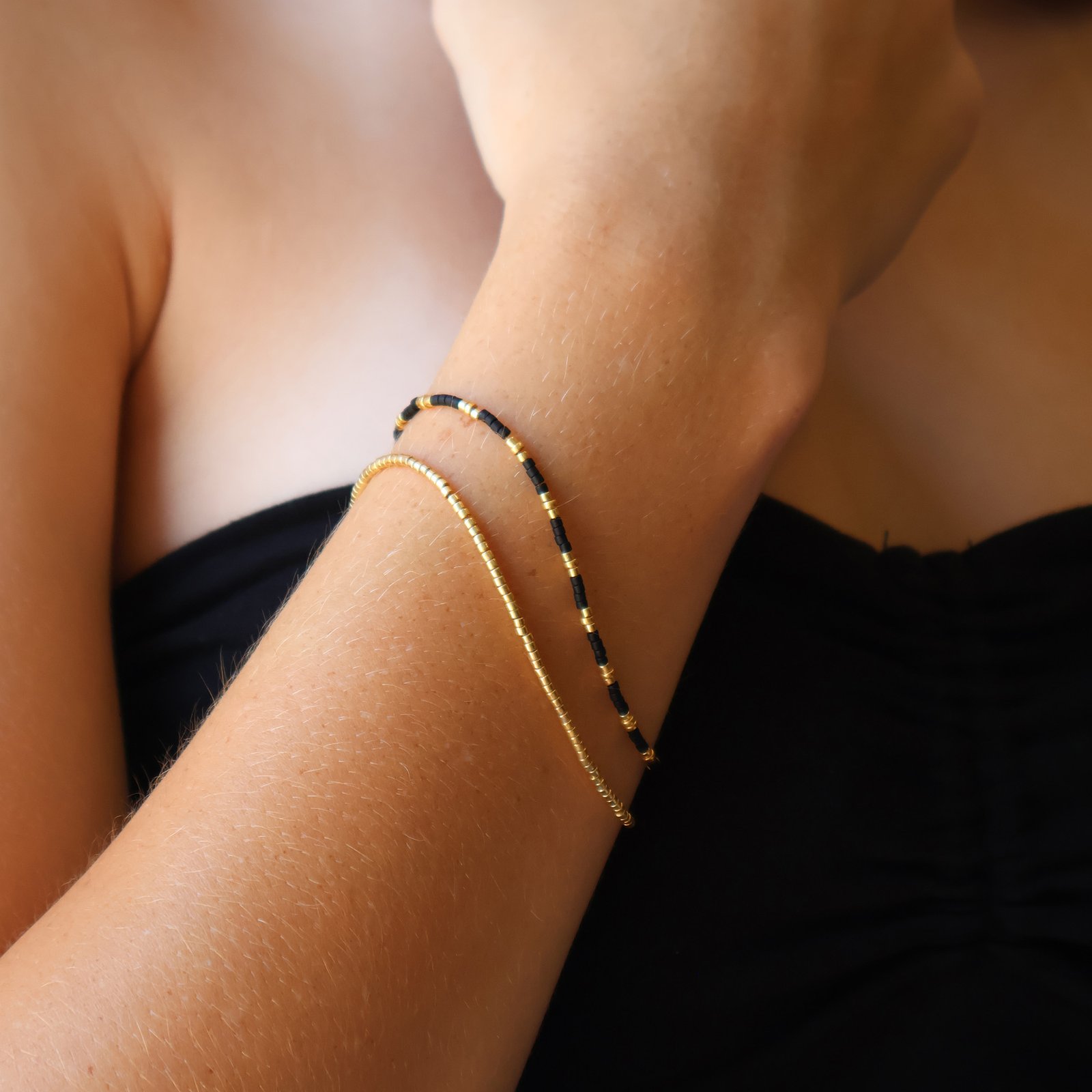 The Midnight Gold Bracelet is your new go-to for that minimalist-meets-bold moment. Designed with premium Miyuki beads in deep black tones and warm gold accents, it adds just the right amount of contrast to any wrist stack.  Wear it solo for a clean, polished look or pair it with your favourite beaded colours for a stylish, everyday mix. Comfortable, durable and made for daily wear, it’s the perfect little detail that goes with absolutely everything.